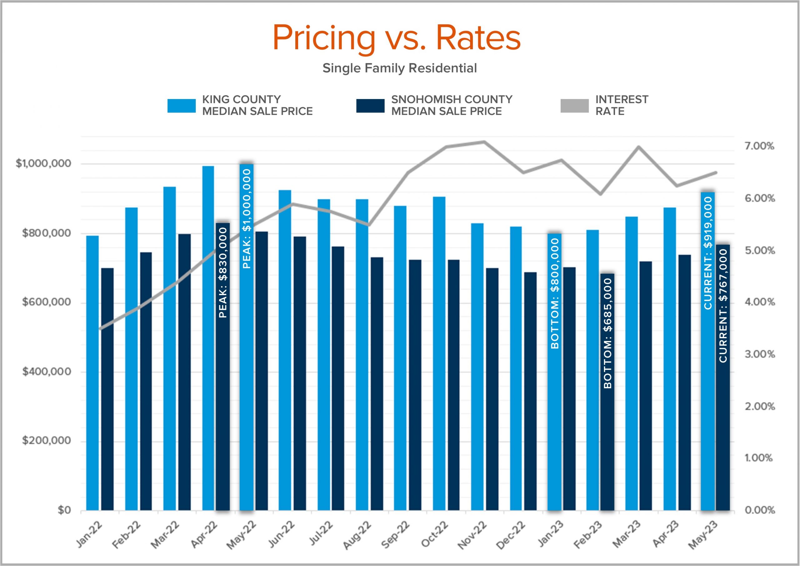 In May 2022, they averaged 5.5% (the peak) and in January 2023 they averaged 6.75% (the bottom). In fact, they started 2022 at 3.5%, a level we will likely never see again! Currently, rates are hovering in the high 6% and are predicted to slowly recede as we enter the second half of 2023. Proof that buyers have become conditioned to the new normal of rates is that prices have grown from the start of 2023 (January - May 2023): 14% in King County and 11% in Snohomish County, despite rates remaining in the 6% and at times cresting 7%. When they go down to the lower 6% or even the high 5%, expect prices to climb at a faster rate. Will there be a buyer mosh pit? Buyers should be weighing these effects as they choose when to act. Rates can always be re-financed, but the sale price cannot.
